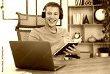 Man in headphones taking notes while passing online test via laptop at table indoors