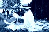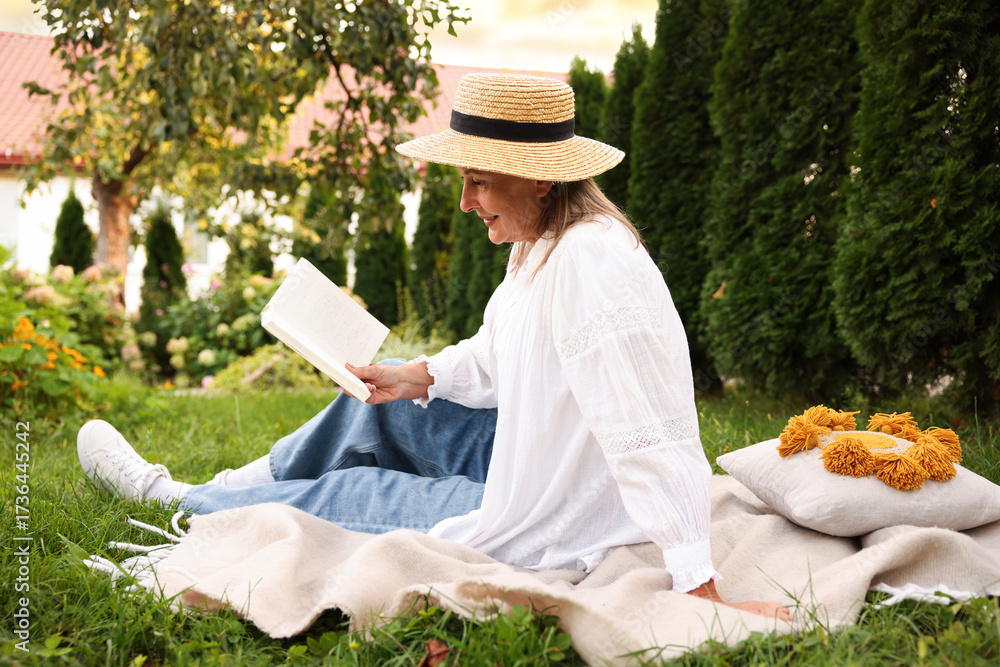Senior woman reading book on blanket in garden