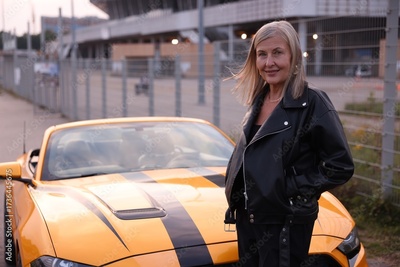 Stylish senior woman near modern cabriolet outdoors