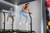 Young women jumping on mini exercise trampolines in fitness studio, low angle view