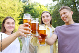 Group of happy friends clinking glasses of beer outdoors, selective focus