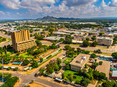 aerial view Gaborone capital of Botswana in Africa, new development in the city center skyscraper, and shopping center