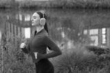 Beautiful woman in headphones running near river outdoors. Space for text