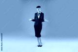 Positive stewardess doing pre-flight safety briefing on light blue background
