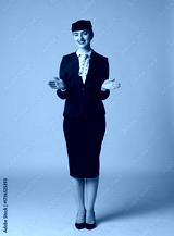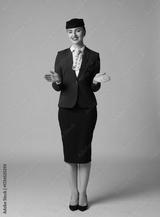 Positive stewardess doing pre-flight safety briefing on light grey background