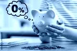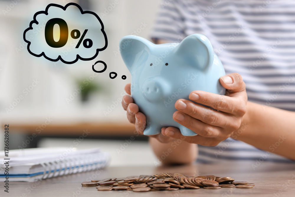 Zero percent commission. Woman holding piggy bank at table, closeup. Speech balloon with thought coming from money box