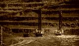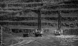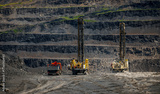 Massive open pit coal mine with heavy drill machinery and layered terrain
