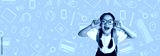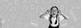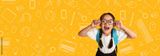 A joyful child wearing glasses holds them up, showing excitement in a school-themed collage. Bright yellow background features various educational elements related to learning and creativity.