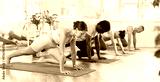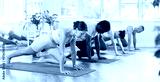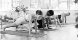Group of multiethnic men and women doing pilates on mat in fitness studio