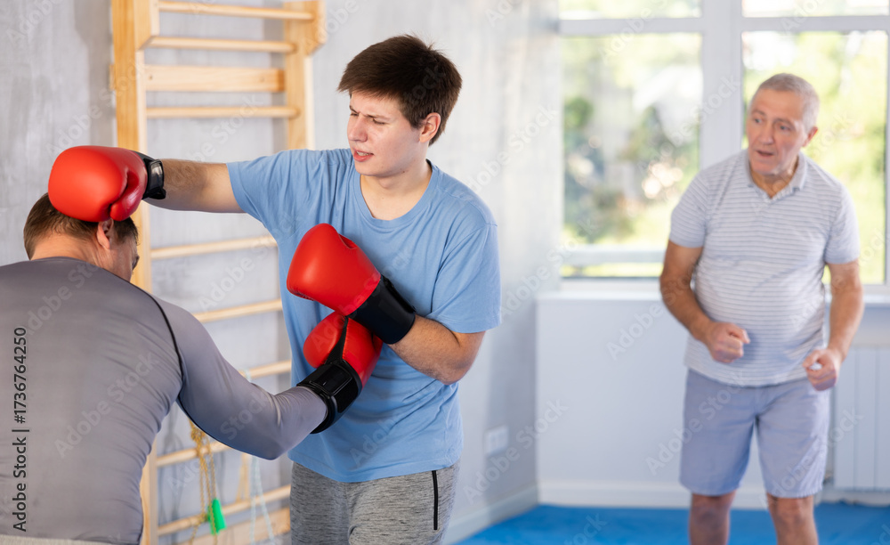 Young man and adult men in boxing gloves boxing in gym