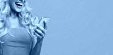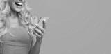 Big Seasonal Sale concept. Portrait of happy amazed blonde woman in sunglasses holding paper shopper bag looking at cell phone screen, blue studio background, copy space. Shocked lady shopping online