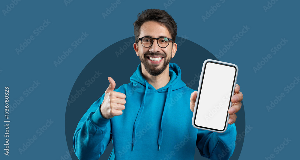 A young man smiles broadly while showing a smartphone with a blank screen. He is wearing a blue hoodie and gives a thumbs up in excitement. The background is a solid blue circle.