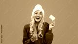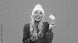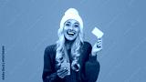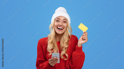 Cybershopping Concept. Cheerful happy woman holding showing golden credit card using smartphone, wearing white winter hat sitting on floor with many shopper bags at blue studio background, banner