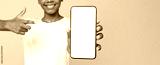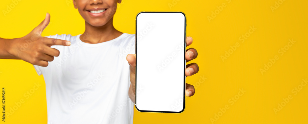 Cheerful teen afro american female pupil in white t-shirt points finger at smartphone with blank screen, isolated on yellow background. Positive facial expression, great website, app or app for study