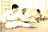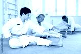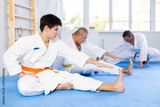 Group of men of different ages in a white kimono doing muscle stretching before karate or judo training