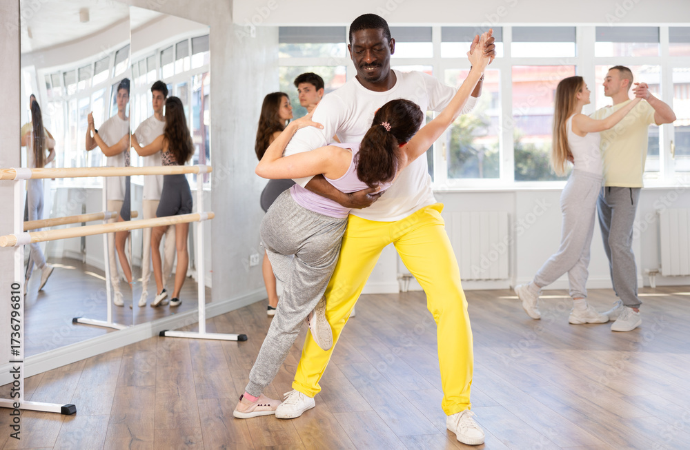 Woman dressed in sport suite dances incendiary tango with African American male partner during choreography lesson. Group training and rehearsal, preparation for competitions