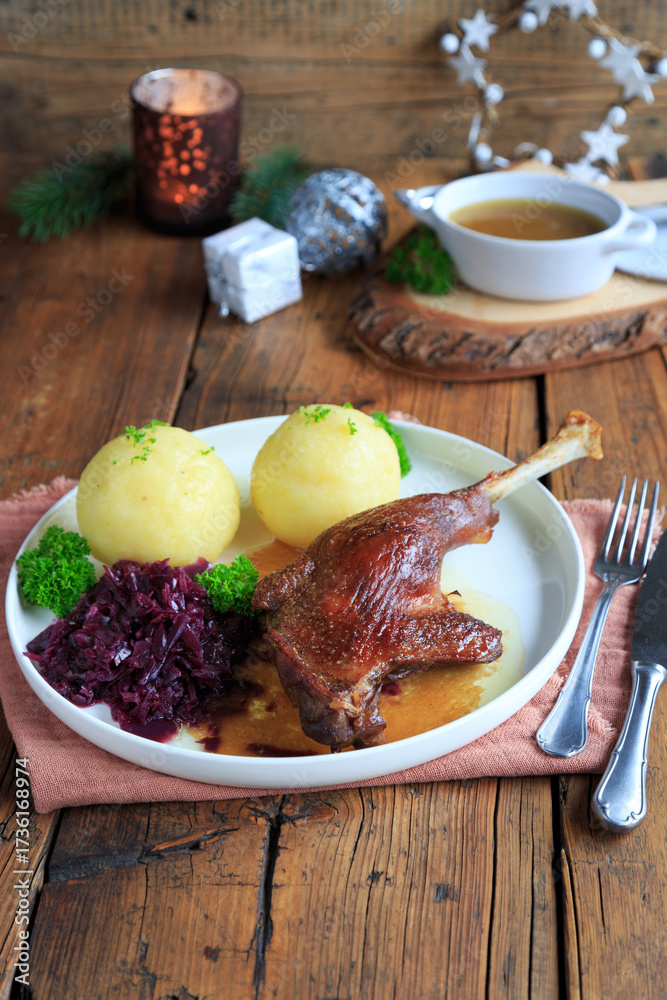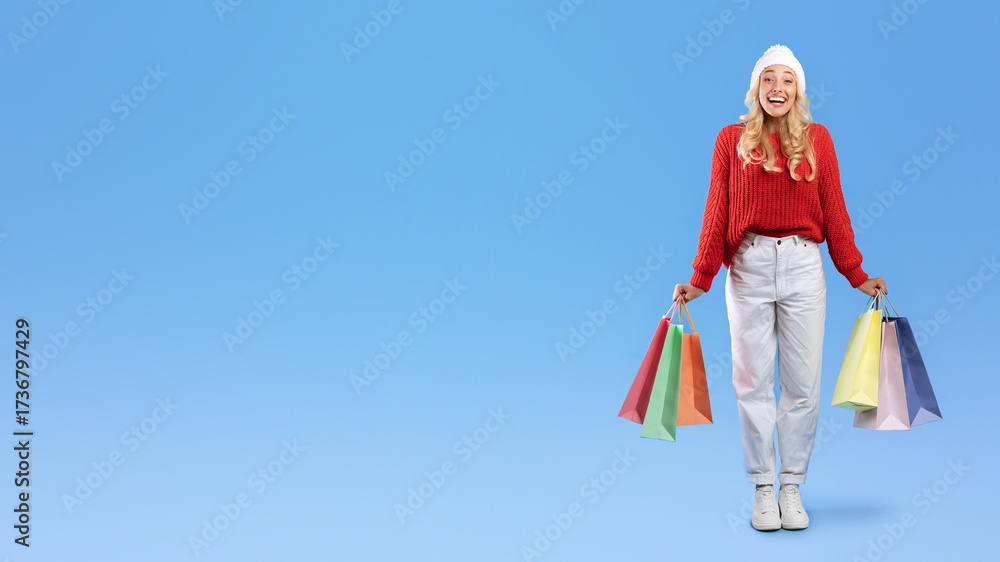 Big Sales And Discount. Full body length portrait of happy lady in white winter hat standing and holding shopping bags, posing isolated over blue studio background, banner, panorama, free copy space