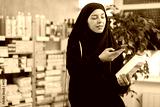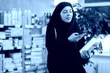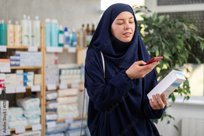 Selective young Muslim woman client scanning QR code on cream in chemist's shop