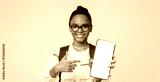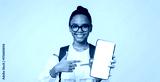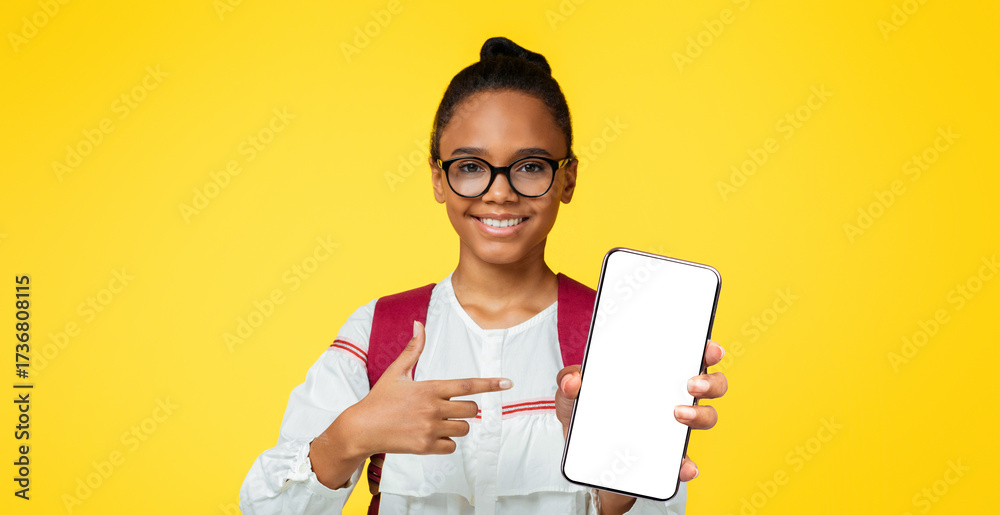 Satisfied smart adolescent black lady pupil in glasses with backpack shows finger at phone with blank screen, isolated on yellow background. App for study, online device, website for remote lesson
