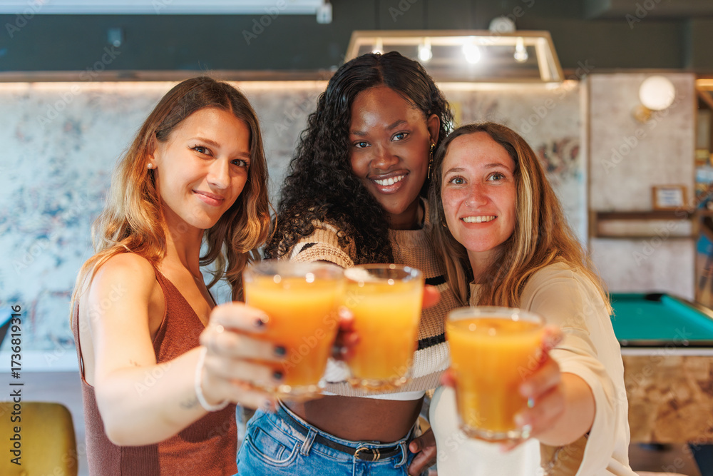 Three smiling young women friends toasting healthy juice drinks in a bar setting