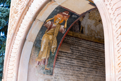 Orthodox fresco in Zica Monastery, Serbia. Saint carries the symbol of the church. Travel to historical places of Europe