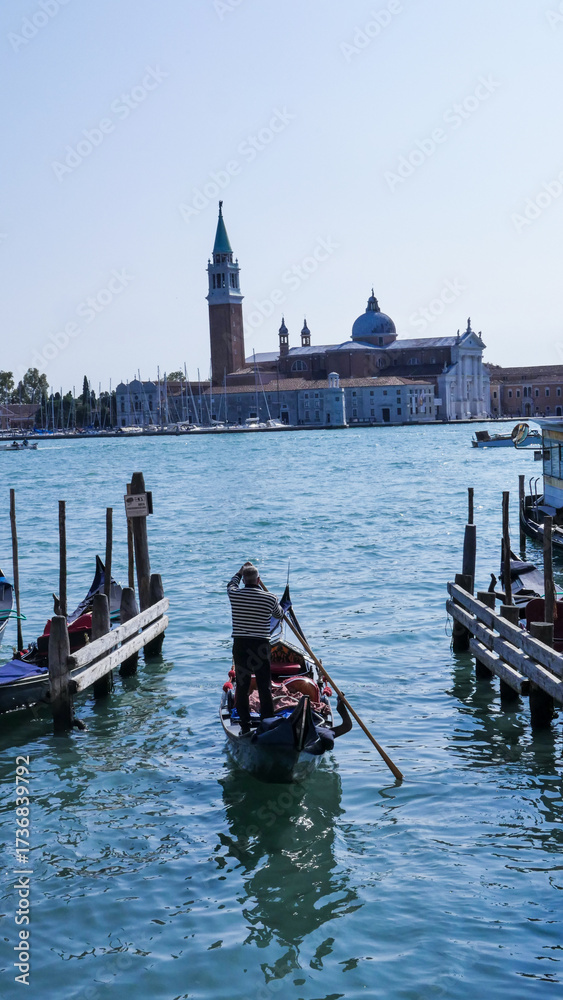 Vertical view of a gondolier in the Grand Canal of Venice, Italy.