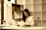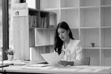 Asian Japanese, businesswoman, female, girl, Korean,Chinese, business woman, office worker secretary manager accountant analyst analyzing documents paperwork report graph project indoors room