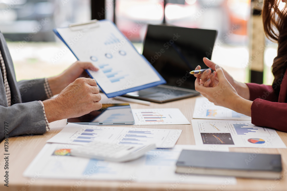 Two Business at meeting room, using laptop discussing business report at office with documents on desk, meeting to planning analyzing the financial report, business plan investment