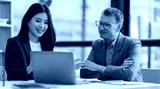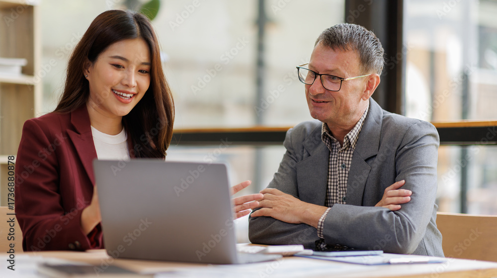 Two Confident male and female professional executives experts discussing financial accounting papers working together