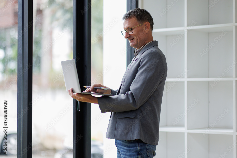 Confident male accountant in glasses analyzing financial report over laptop while standing in office