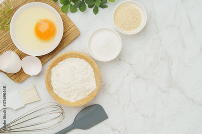 料理・お菓子づくりのイメージ(小麦粉・卵・塩・きび砂糖)・白い大理石背景