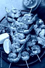 Skewers with tasty grilled shrimps, lime slices, parsley, lettuce and sauce on grey table, top view. Delicious seafood dish
