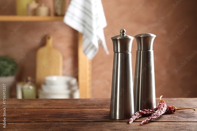 Metal salt, pepper shakers and dry chili peppers on wooden table in kitchen, closeup. Space for text