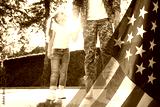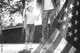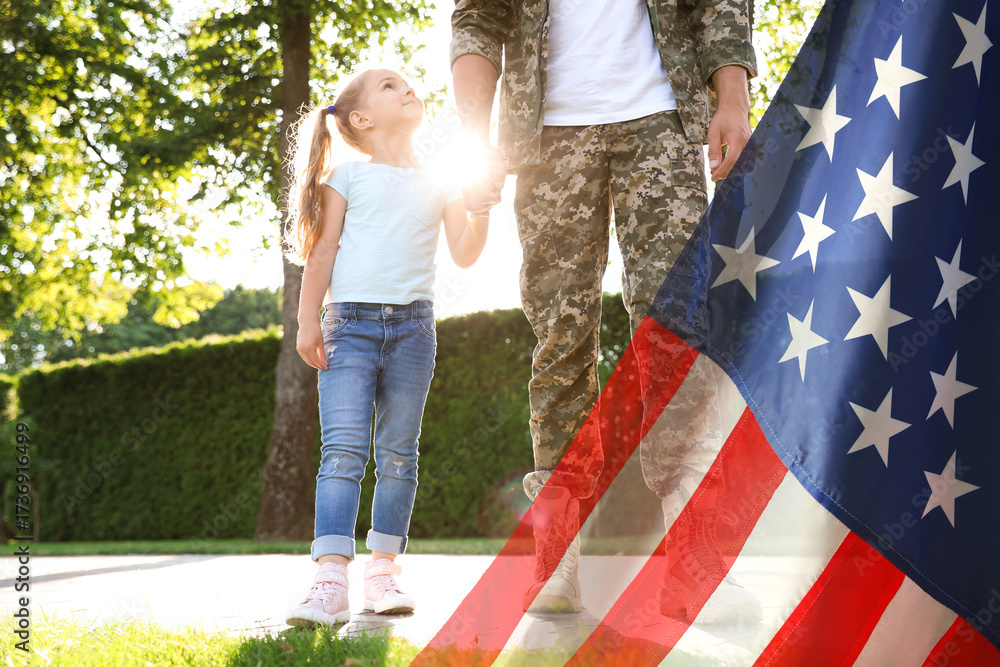 Military man and his daughter outdoors, double exposure with national flag of USA