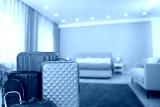 Spacious hotel room with comfortable furniture and guest luggage, selective focus