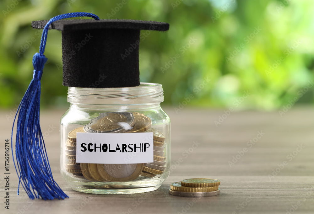 Scholarship. Glass jar with coins and graduate hat on wooden table