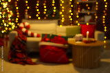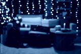 Blurred view of dark living room with glowing Christmas lights and sofa