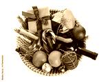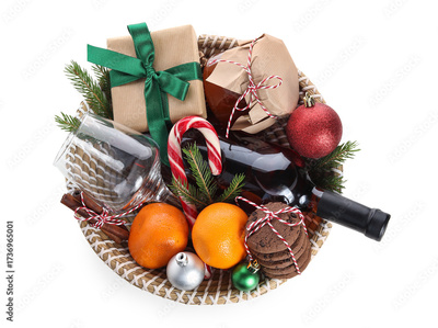 Wicker gift basket with products, bottle of wine and Christmas decor isolated on white background