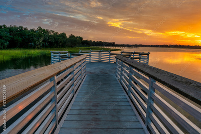 Serene sunset view from wooden pier overlooking tranquil waters and lush greenery in early evening hours