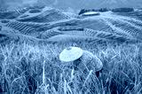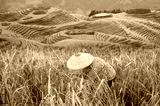 A beautiful woman in black tights and a conical hat made of a basket walks through the rice fields - Terraced rice fields, Longshen near Guilin, Guangxi Province, People's Republic of China