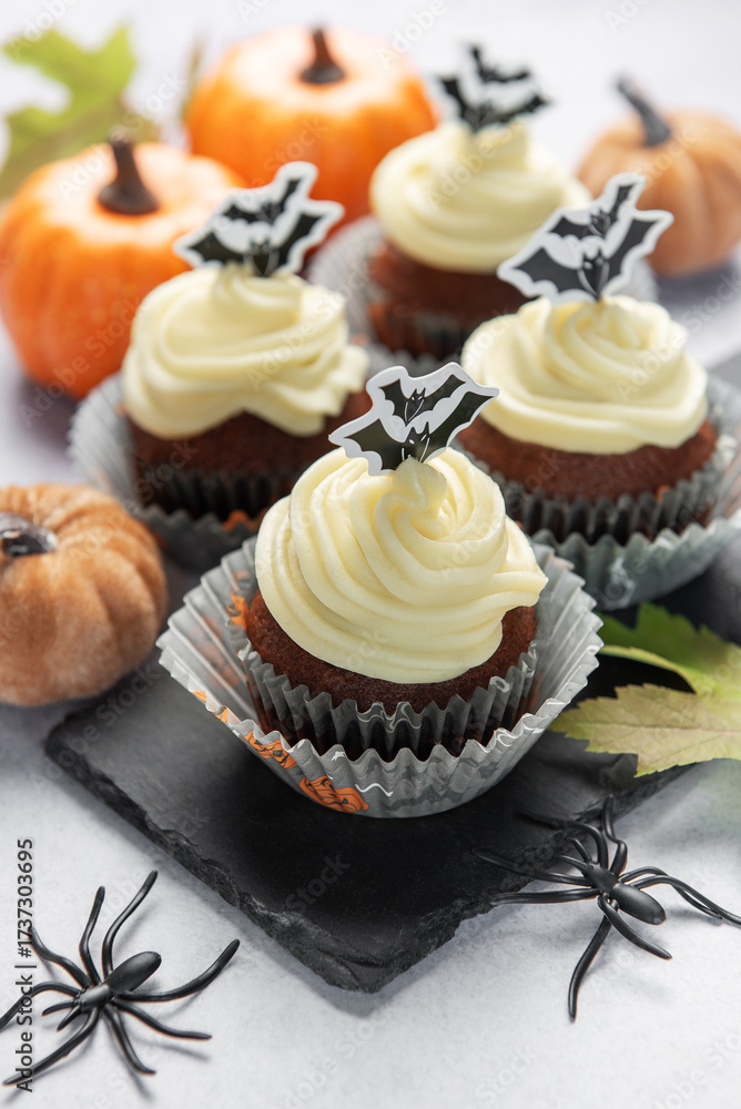 Halloween cupcakes with bat toppers and pumpkin decorations