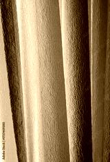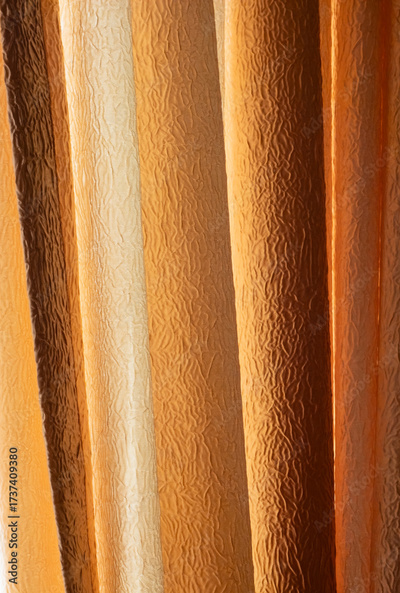 Textured brown and gold curtain fabric with vertical folds in warm sunlight