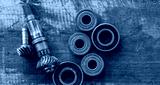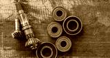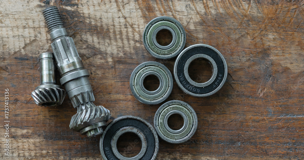 Top view a collection of metal ball bearings and bevel gears laid out on a worn wooden surface, likely in a workshop or repair setting.
