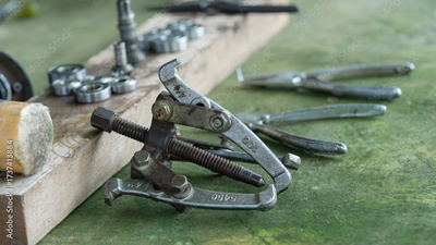 A metal bearing puller tool on a workshop table with pliers and ball bearings, used for mechanical maintenance and engineering tasks, essential for disassembly and repair of machinery components.