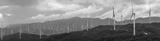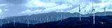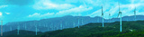 A large wind farm with modern wind turbines generating clean and renewable electricity on a beautiful green mountain landscape