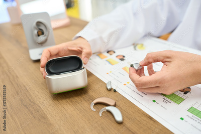 Audiologist explaining hearing aid technology to a patient