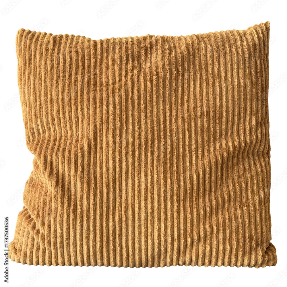 Soft square pillow with yellow corduroy fabric texture, isolated on white. Suitable for interior design, cozy home decor projects, or product presentations.