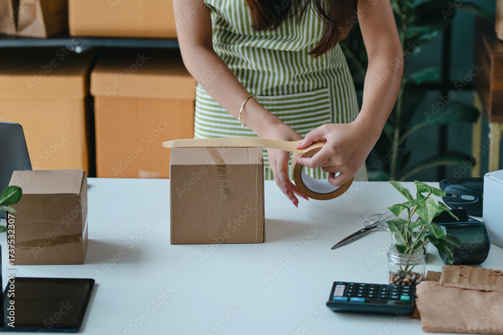 Small business owner packing in the cardbox preparing parcel for delivery online selling sell Online on the Internet from home