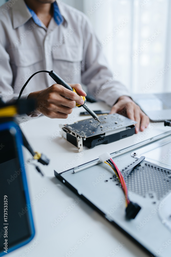technician fixes computer PC components in a technical lab