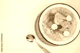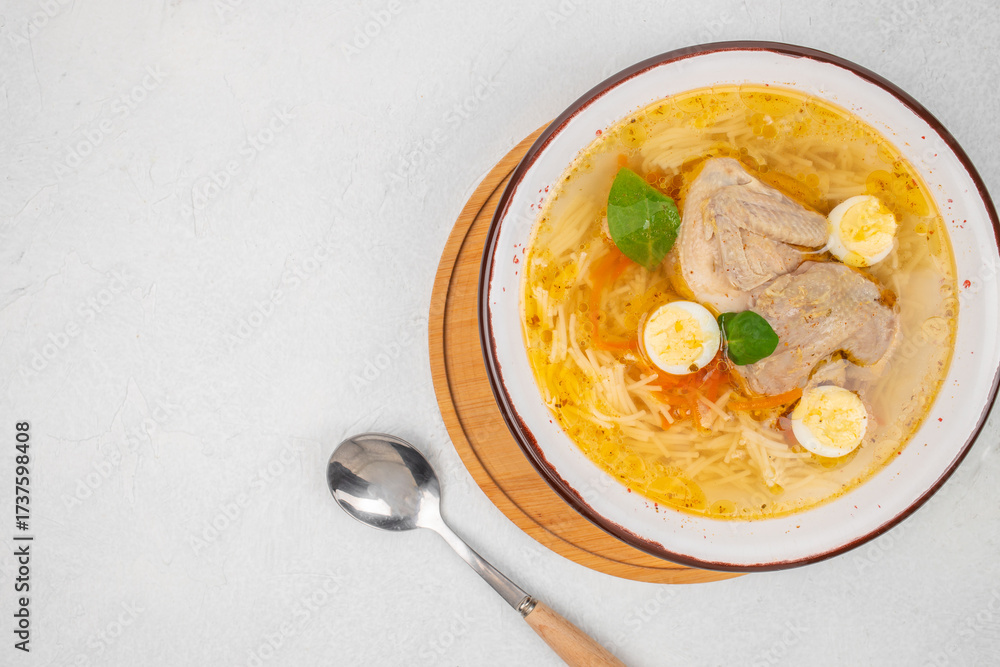 Homemade quail soup with noodles, quail meat, boiled quail eggs, and vegetables served in a white bowl with spoon on light background. top view. copy space